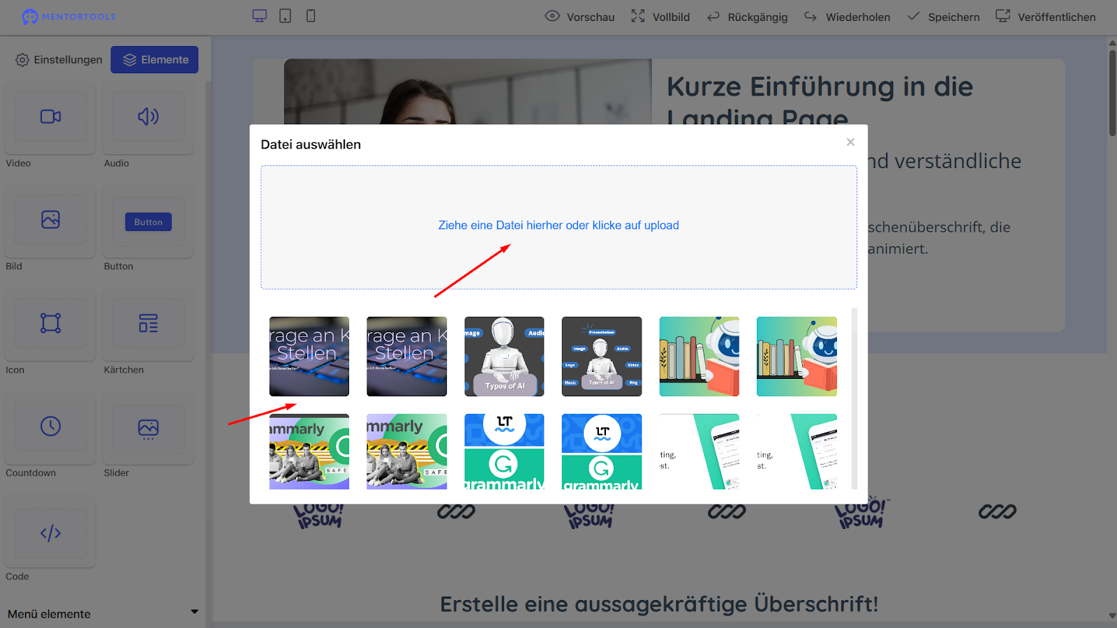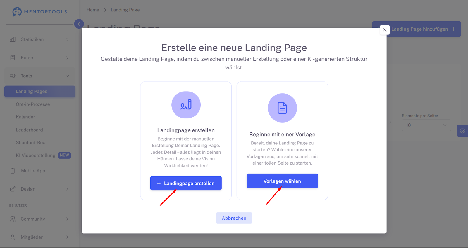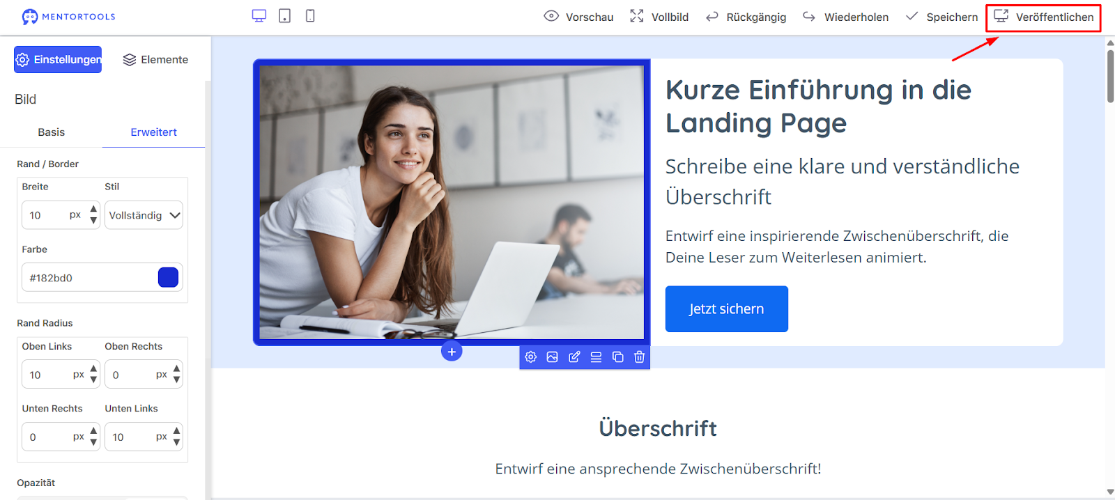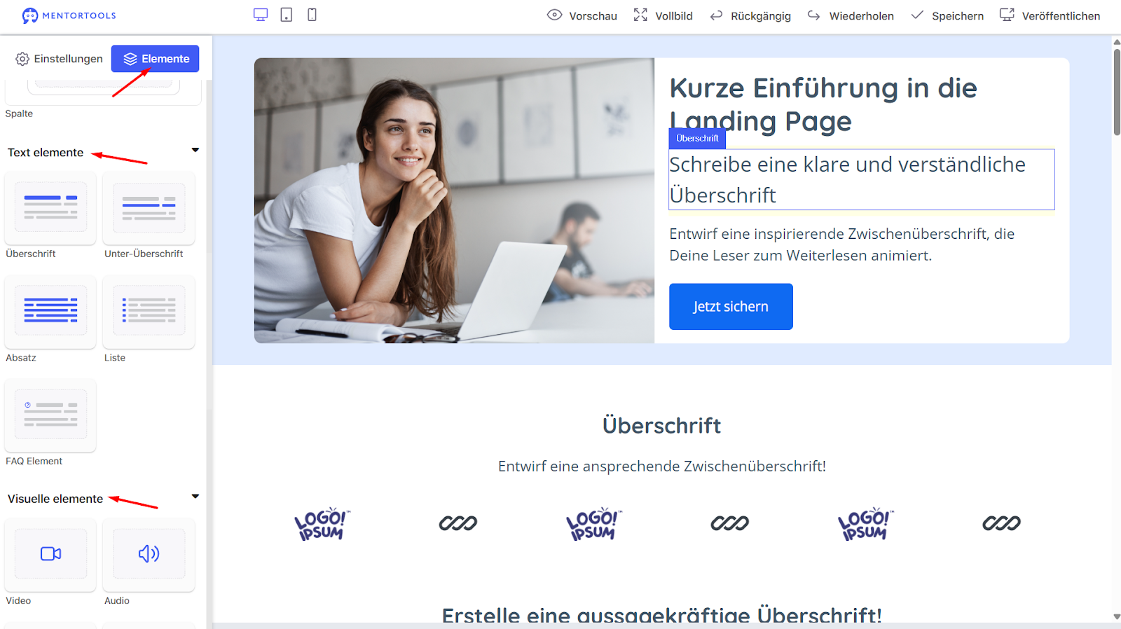 Erste Schritte mit dem Landing Page Builder in Mentortools