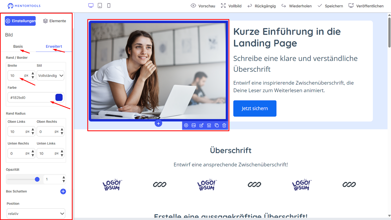 Du kannst sowohl Basiseinstellungen als auch erweiterte Einstellungen vornehmen. (Unten im Beispiel haben wir dem Bild einen Rand hinzugefügt.)