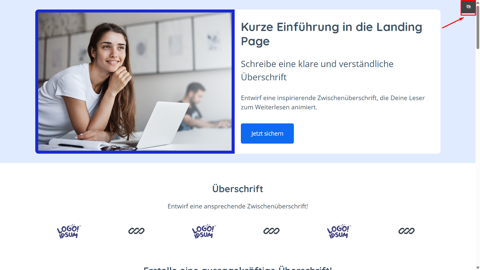 Desktop-/Mobil-Ansicht: Wechsle zwischen der Desktop- und Mobil-Ansicht, um sicherzustellen, dass deine Landing Page auf allen Geräten optimal dargestellt wird. Klicke dazu einfach auf das entsprechende Symbol (Desktop/Smartphone/Tablet).