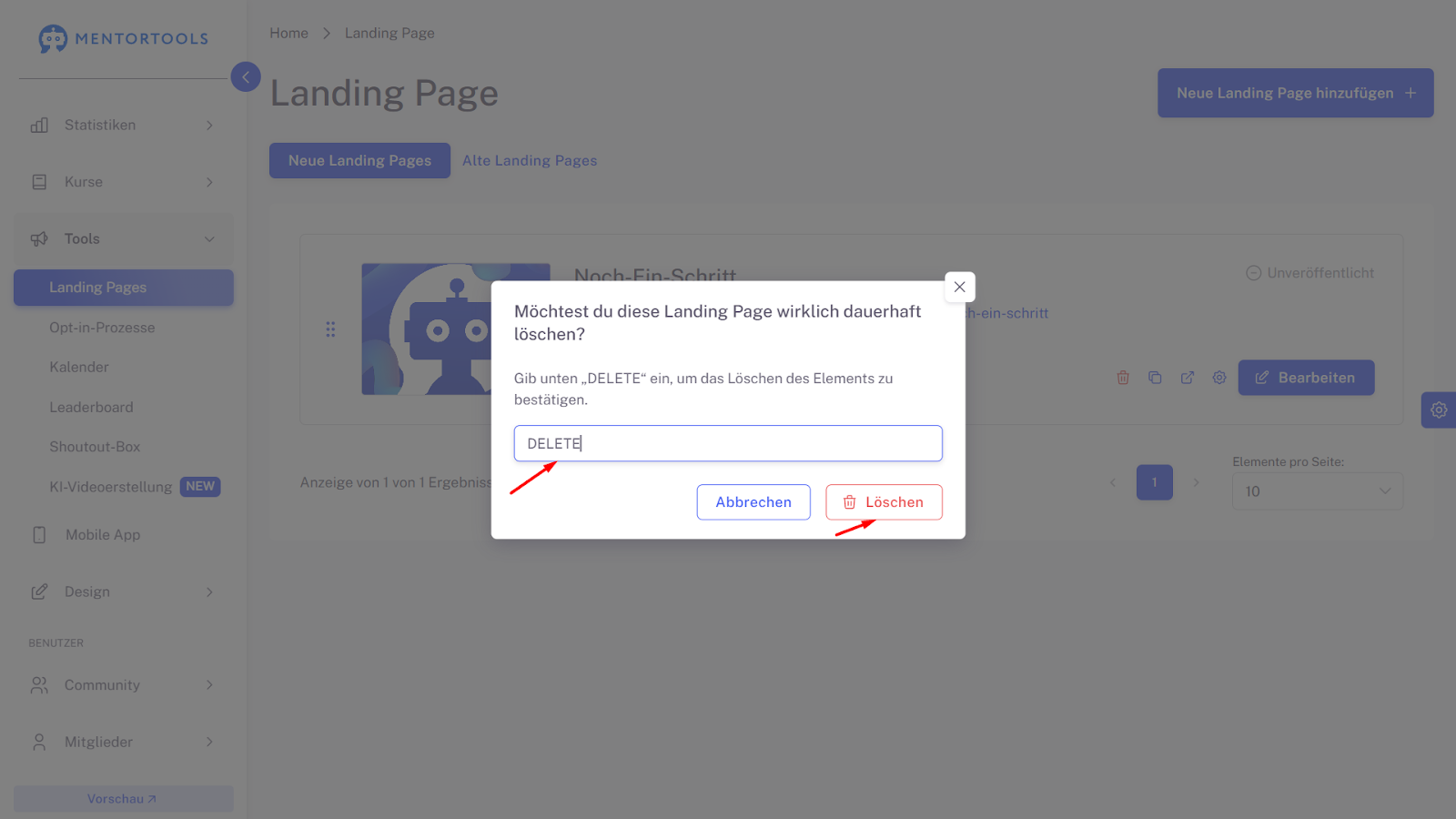 Danach wirst du aufgefordert, das Wort „delete“ – auf Deutsch „löschen“ – in das Textfeld einzugeben. Erst danach kann die Landing-Page gelöscht werden.