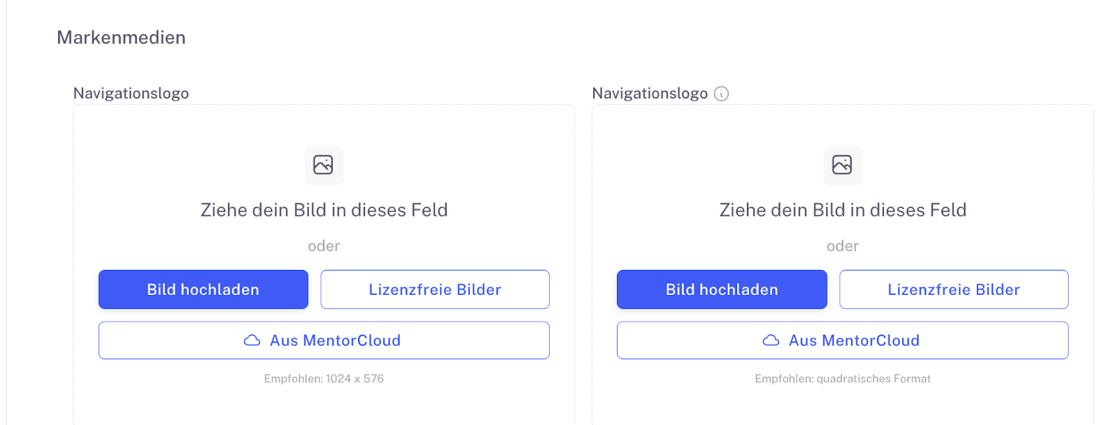 Unter Markenmedien lädst du dein Logo oder spezielle Bilder hoch - aus deinen eigenen Dateien, der Mentorcloud oder unseren lizenzfreien Bildern.