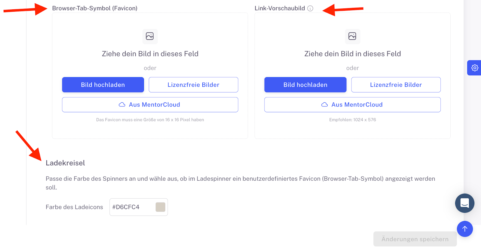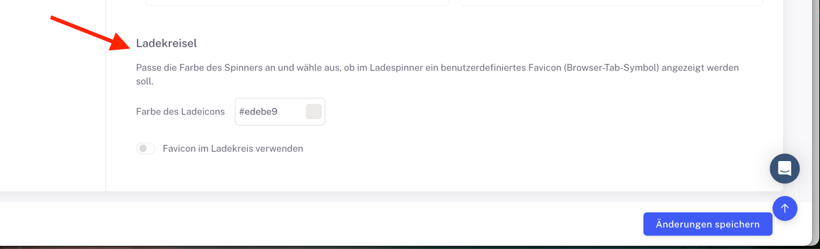 Unter Ladekreisel passt du die Farbe des Spinners an. Wähle hier aus, ob im Ladespinner ein benutzerdefiniertes Favicon (Browser Tab Symbol) angezeigt wird.