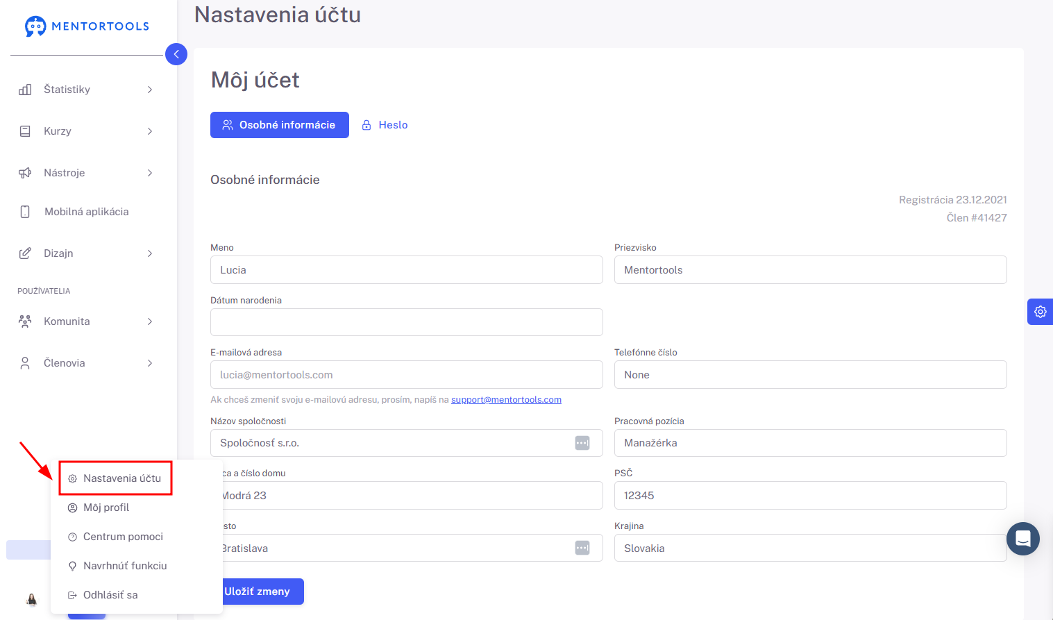 Prihlás sa do svojej členskej sekcie a v bočnom paneli - úplne v spodnej časti - klikni na svoju fotku a následne prejdi na položku “Môj profil”.