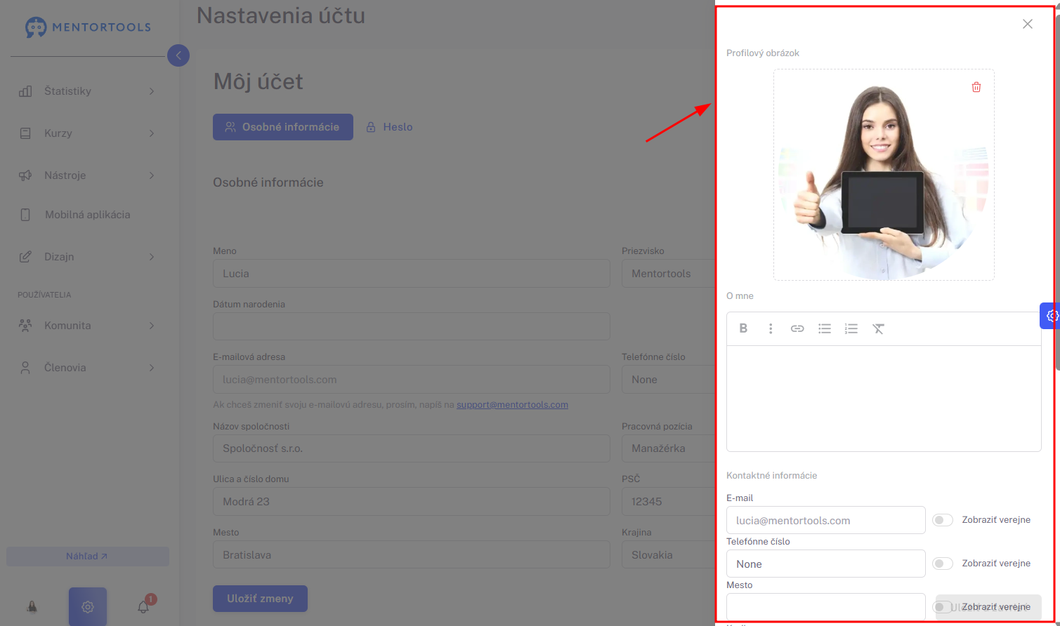 Nastavenia profilu slúžia na to, aby si sa osobne predstavil/a. Tu upravuješ informácie, ktoré sú viditeľné pre ostatných používateľov. Je to tvoja "vizitka" v rámci platformy - online akadémie.