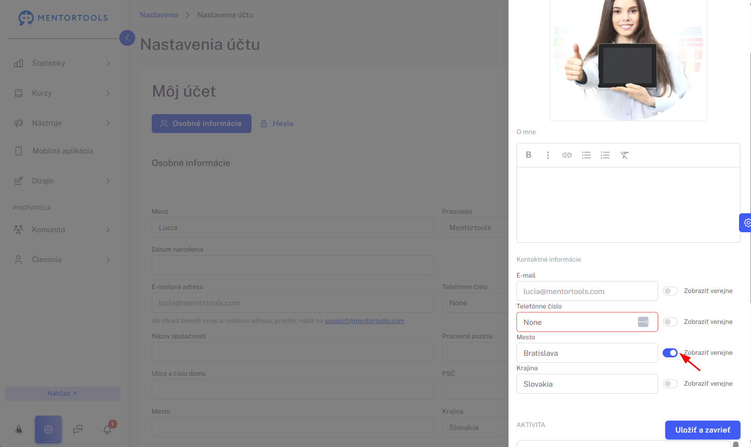 Vedľa každého políčka pri kontaktných informáciách sa nachádza posuvník, pomocou ktorého môžeš rozhodnúť, či bude táto informácia viditeľná pre ostatných. Možnosť „Zobraziť verejne“ nie je predvolene aktivovaná, čo znamená, že tvoje údaje zostanú súkromné, pokiaľ ich aktívne nezdieľaš.